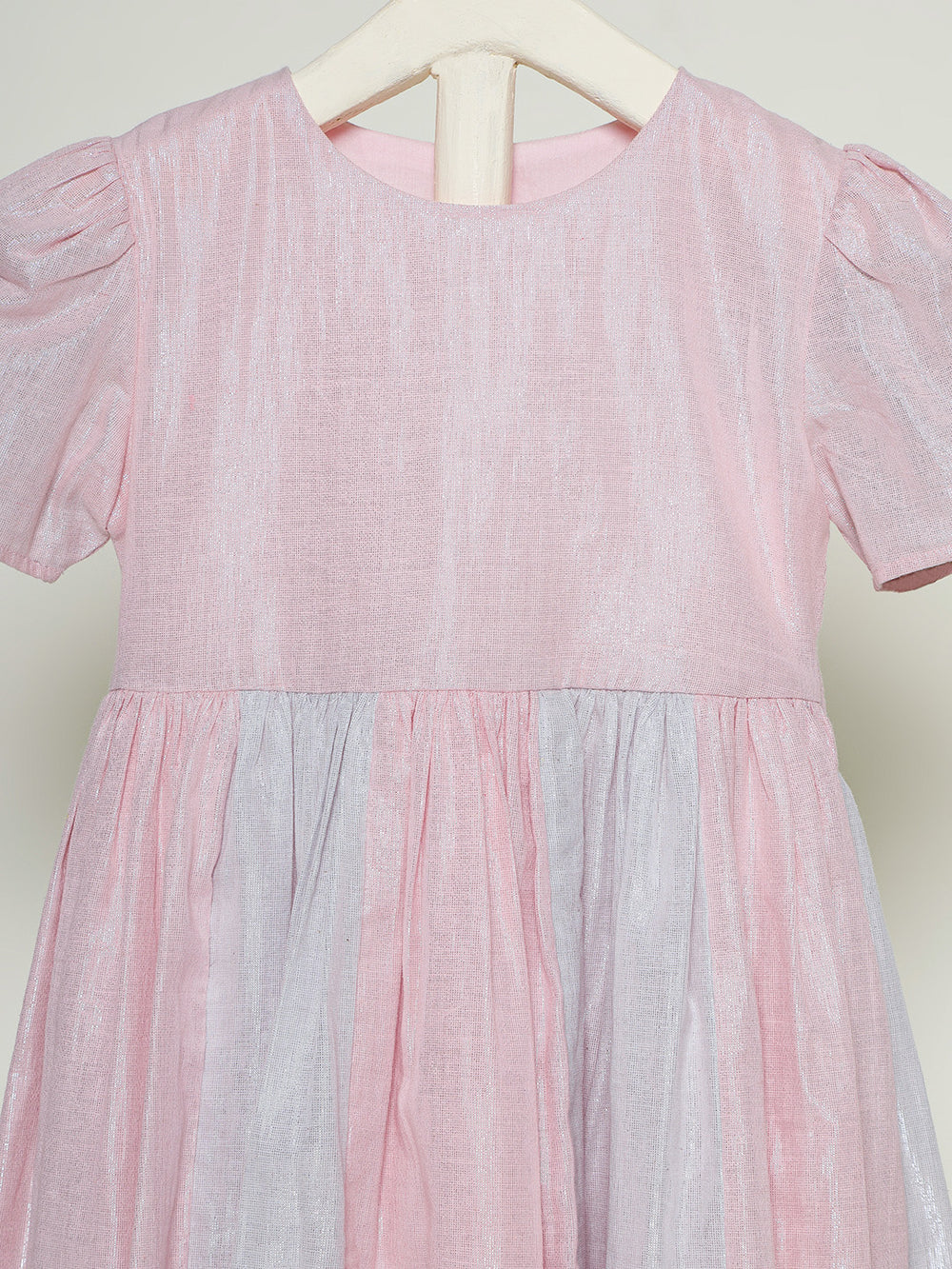 Designed for little celebrations and twirling moments. The Baby Girl Pink & Silver Lurex Cotton Party Dress is crafted in soft cotton panels woven with delicate lurex threads that create a subtle shimmer. The pink and silver color block detailing adds a playful yet elegant charm, while the gathered skirt allows beautiful movement as your little one twirls. Perfect for birthdays, festive occasions, and special outings, the dress comes with a matching hair accessory to complete the look.